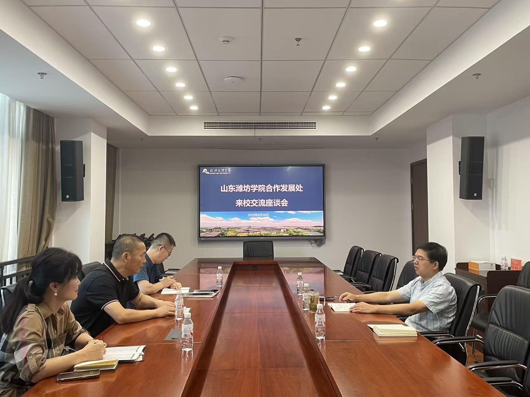 9月29日,山东潍坊学院合作发展处副处长孙孝波一行来校座谈交流。地方合作处处长陈剑波及部门相关人员参加座谈会。