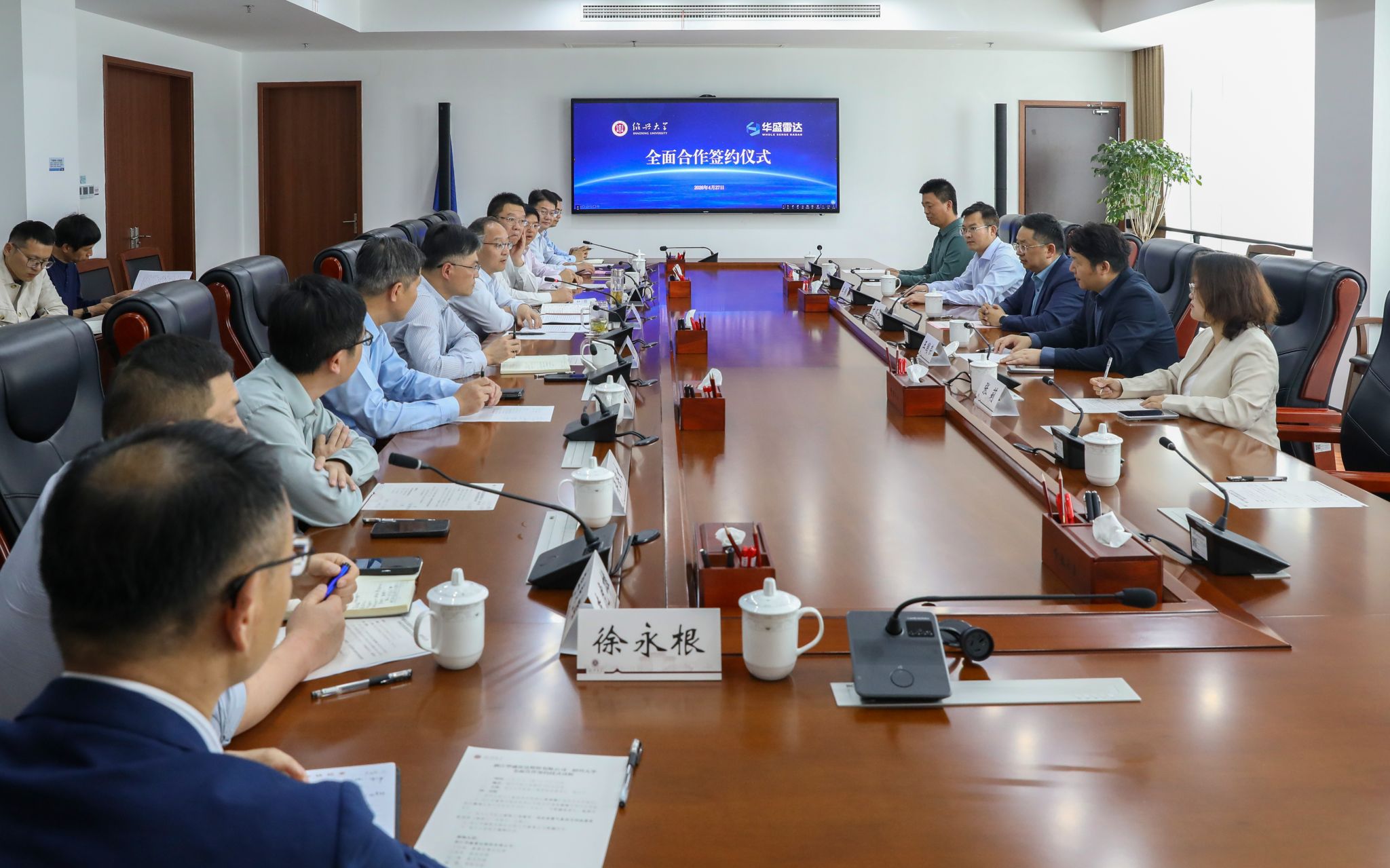 4月27日下午,绍兴大学与浙江华盛雷达股份有限公司举行签约仪式,校长赵阳、副校长陈均土,浙江华盛雷达股份有限公司董事长兼总经理寸怀诚、副总经理王国荣、王振等出席签约仪式。