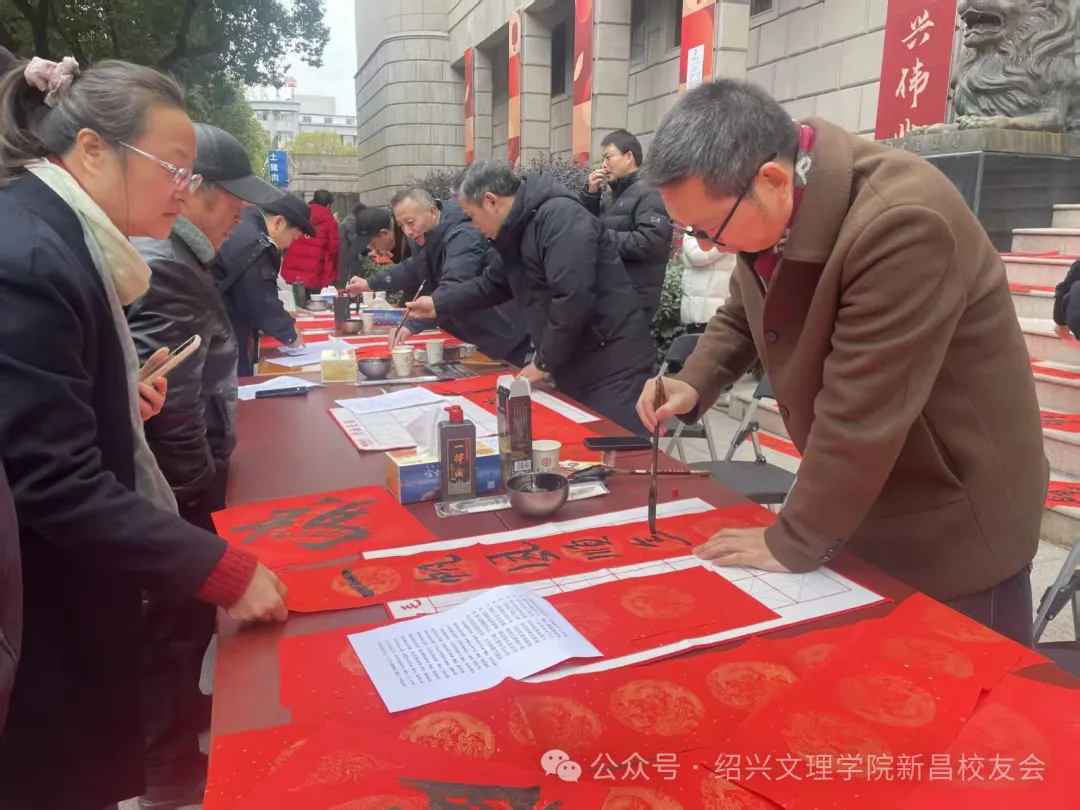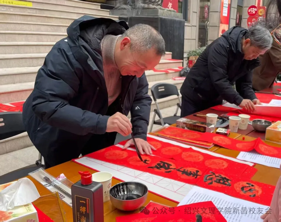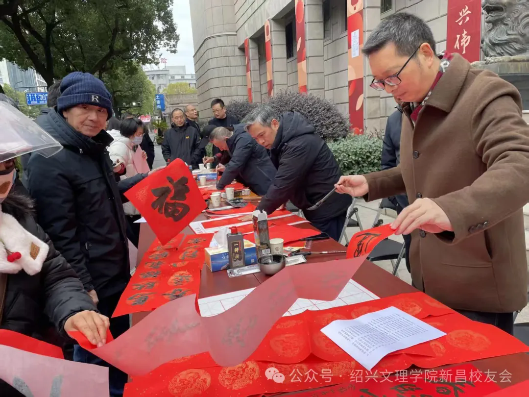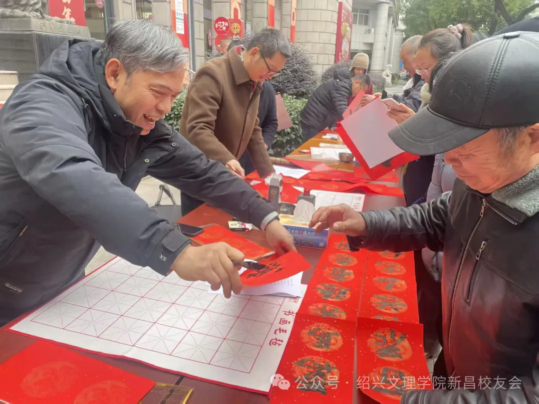这是绍兴文理学院新昌校友会第五次开展写春联送祝福活动。本次活动,既发挥了爱好书法的校友的特长,展现了传统书法艺术的独特魅力,也以这种朴素的方式向广大人民群众传递了校友会和中国银行真挚的春节祝福。